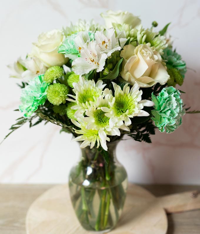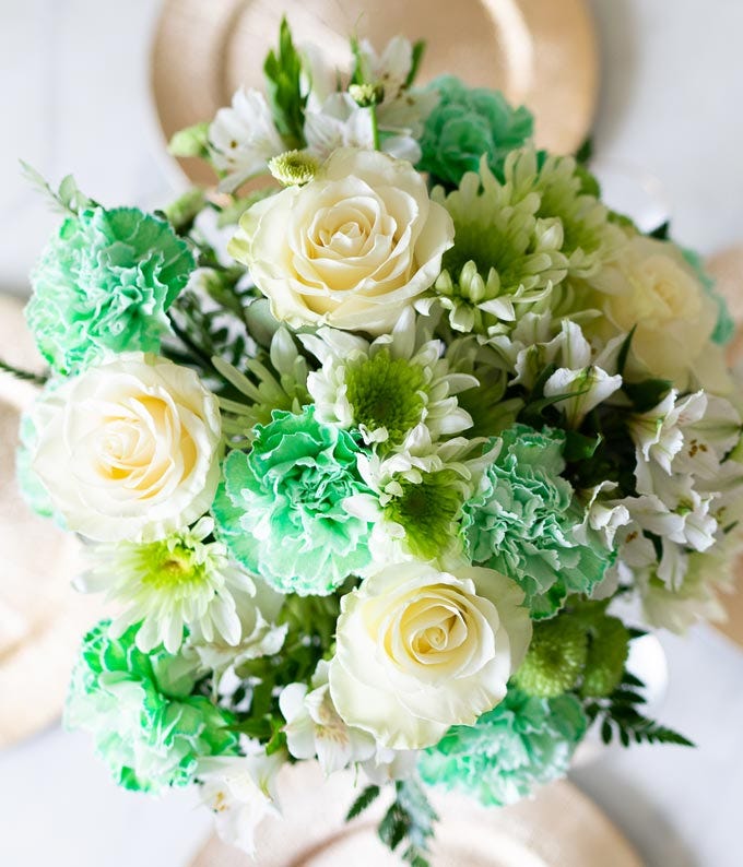 طازجة ومعدة لتضيف لمسة من اللون الأخضر، تتكون هذه الباقة المذهلة من الورود الخضراء و القرنفل الأخضر، مُنسقة بشكل جميل مع وسائد بيضاء لتخلق ترتيبًا ينبض بالألوان والأناقة.