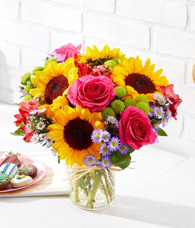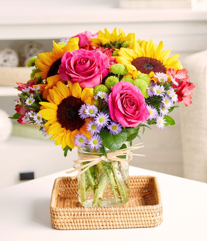 ابدأ صباح من تحب بألوان مشرقة وطاقة إيجابية مع هذه الباقة الرائعة. تتوسطها عباد الشمس المضيئة، محاطة بأزهار ألسترويميريا الحمراء والورود الوردية وكرات الزهور الخضراء الصغيرة، كلها مرتبة بشكل أنيق داخل إناء زجاجي ملفوف بخيوط الرافيا الطبيعية.