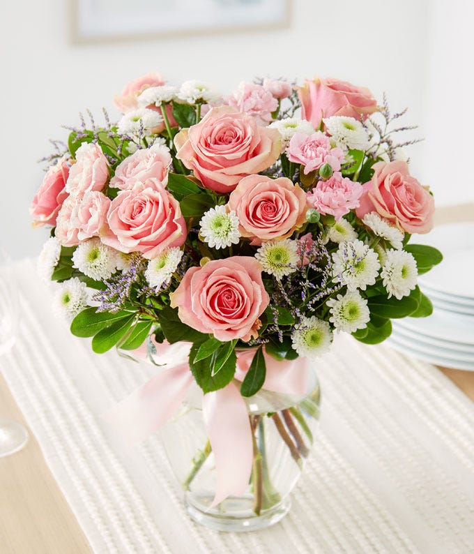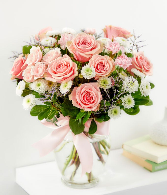 أرسل لمن تحب لمسة من الرقة والجمال مع هذه الباقة المميزة. تتكون الباقة من الورود الوردية والفاتحة والورود البيضاء، مع ميني قرنفلات وكرات زهور خضراء صغيرة، مرتبة بعناية في إناء زجاجي شفاف مزين بشريط وردي فاتح. هذه الباقة الرقيقة تعبر عن الحب والتقدير بطريقة أنيقة وجميلة، لتكون هدية مثالية لأي مناسبة.